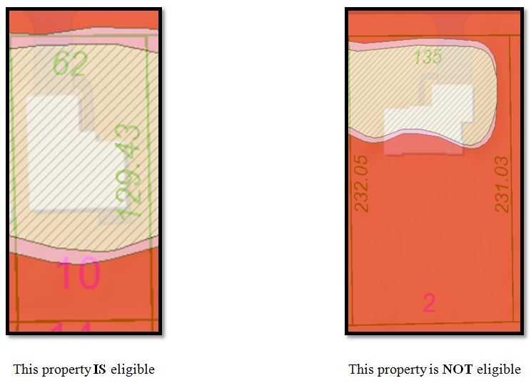 Homeowners can file a Letter of Map Amendment-Out as Shown (LOMA-OAS) if a portion of their property is located within the SFHA, but their actual structure does not touch the SFHA. Please see the example below on an eligible property and an ineligible property to apply for a LOMA-OAS: